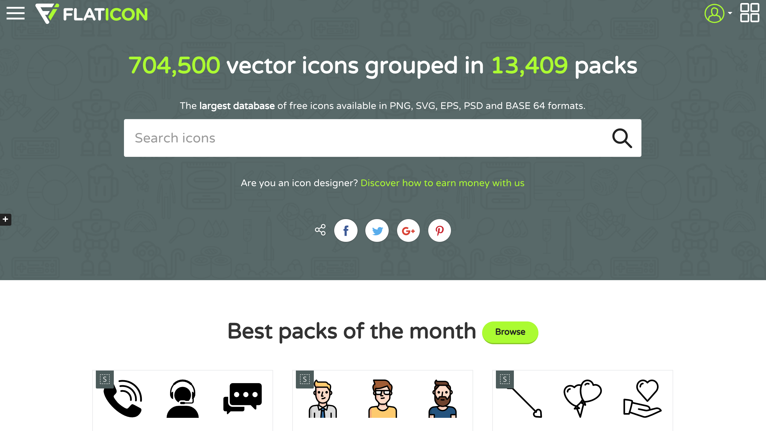 مكتبة ضخمة توفر أكثر من ٧٠٠ ألف فيكتور وأيقونة للتحميل بعدد من الصيغ وبدقة عالية، كثير منها مجانية، مع إمكانية تغيير لون الأيقونة قبل تحميلها..