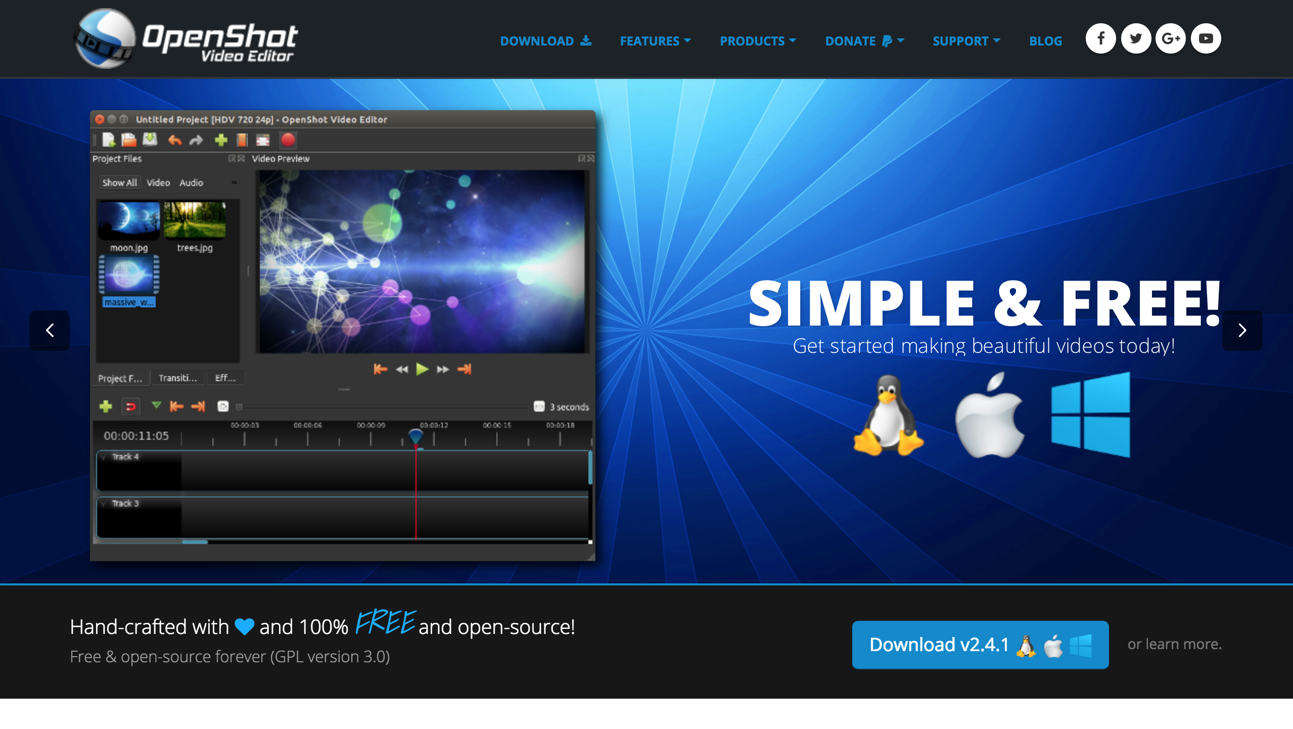 برنامج مجاني لتحرير الفيديو بمميزات كثيرة ومفيدة، كإضافة التأثيرات وقص وتكرار المشاهد وإضافة النصوص والحركات البطيئة والسريعة وغيرها. يعمل على الويندوز والماك واللينكس.