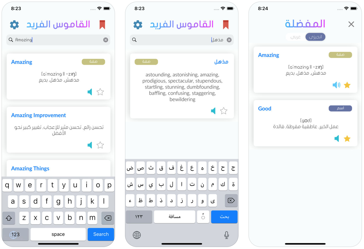 قاموس "عربي - إنجليزي، إنجليزي - عربي" للآيفون، يحتوي قرابة ٣٠٠ ألف مُدخل، يترجم لك أي كلمة مع إمكانية نطقها باللكنة البريطانية أو الأمريكية، مع إظهار نوع اللفظ، ولا يحتاج إلى إنترنت.