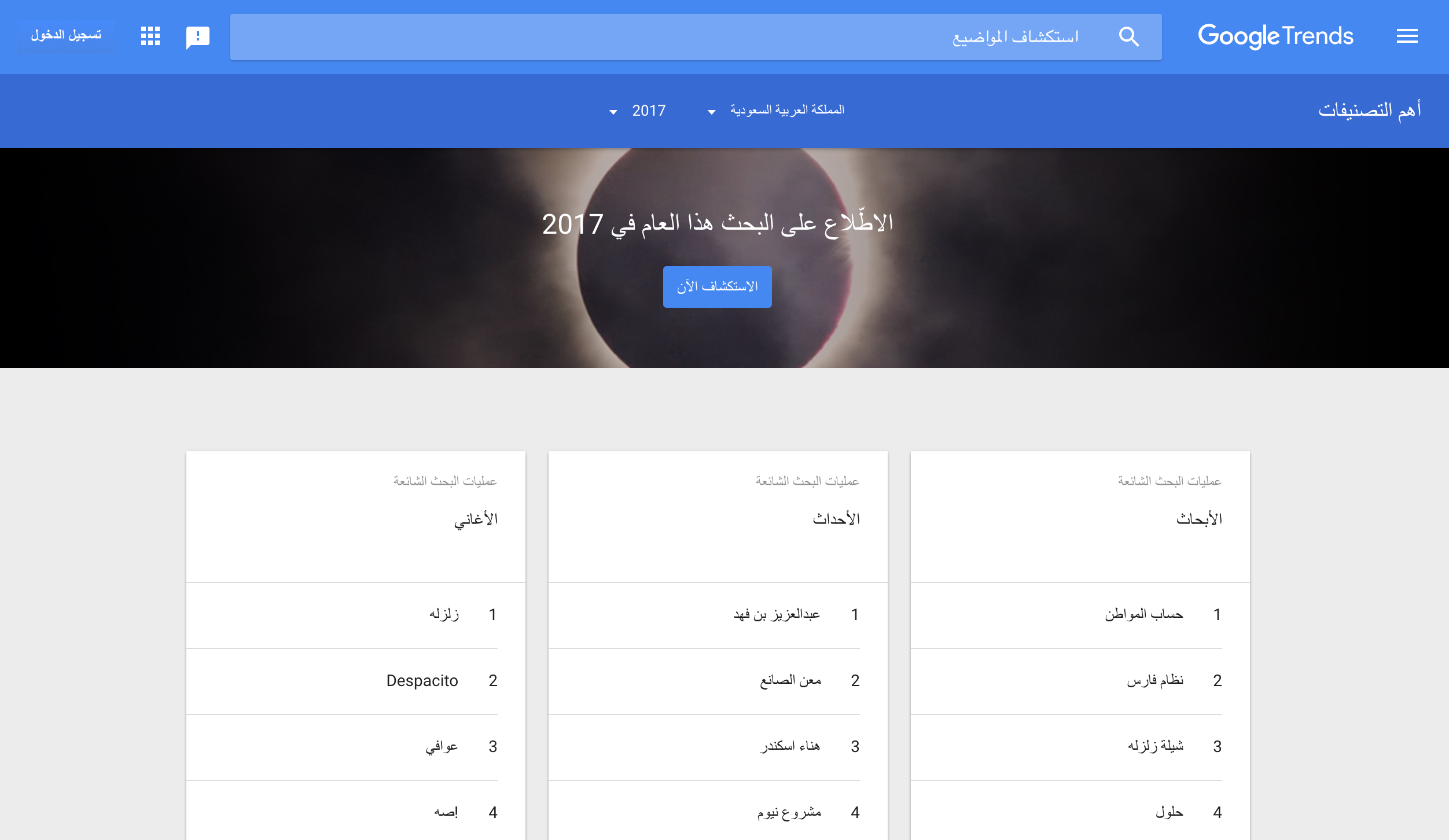 صفحة من جوجل تبيّن ما هي أكثر الأمور التي بحث عنها سكان السعودية خلال أي عام من الأعوام الماضية. بحيث يعطيك قائمة بالكلمات التي تم البحث عنها بكثرة..