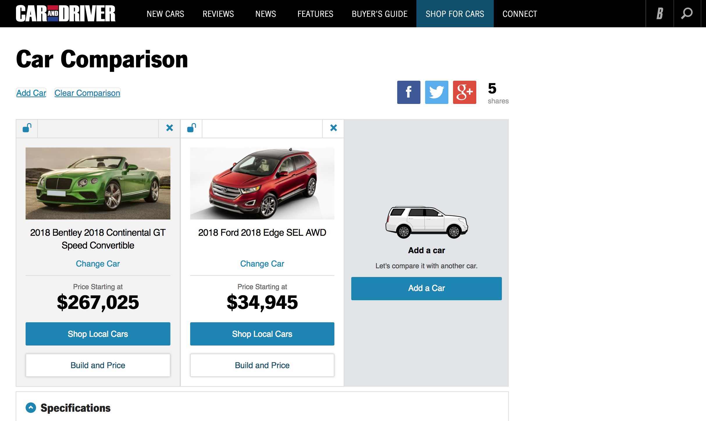 موقع مفيد للمقارنة بين جميع أنواع السيارات من ناحية جميع المواصفات التي قد تحتاجها، فإذا كنت تريد شراء سيارة واحترت بين عدد من السيارات فقم بعمل هذه المقارنة لمعرفة الأفضل، كما أن الموقع يعطيك سعر السيارة المعتمد من المصنع.