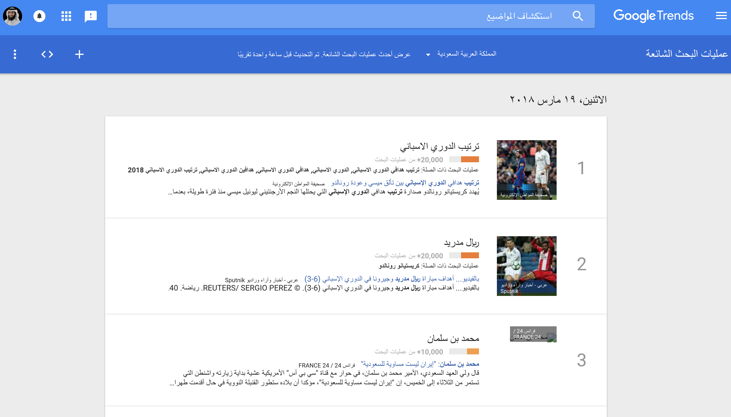 يمكنك معرفة أشهر المواضيع التي قام الناس بالبحث عنها عبر جوجل خلال اليوم أو الأيام الماضية وكذلك يمكنك الاطلاع على عدد مرات البحث عن هذا الموضوع حسب الدولة التي تريد.