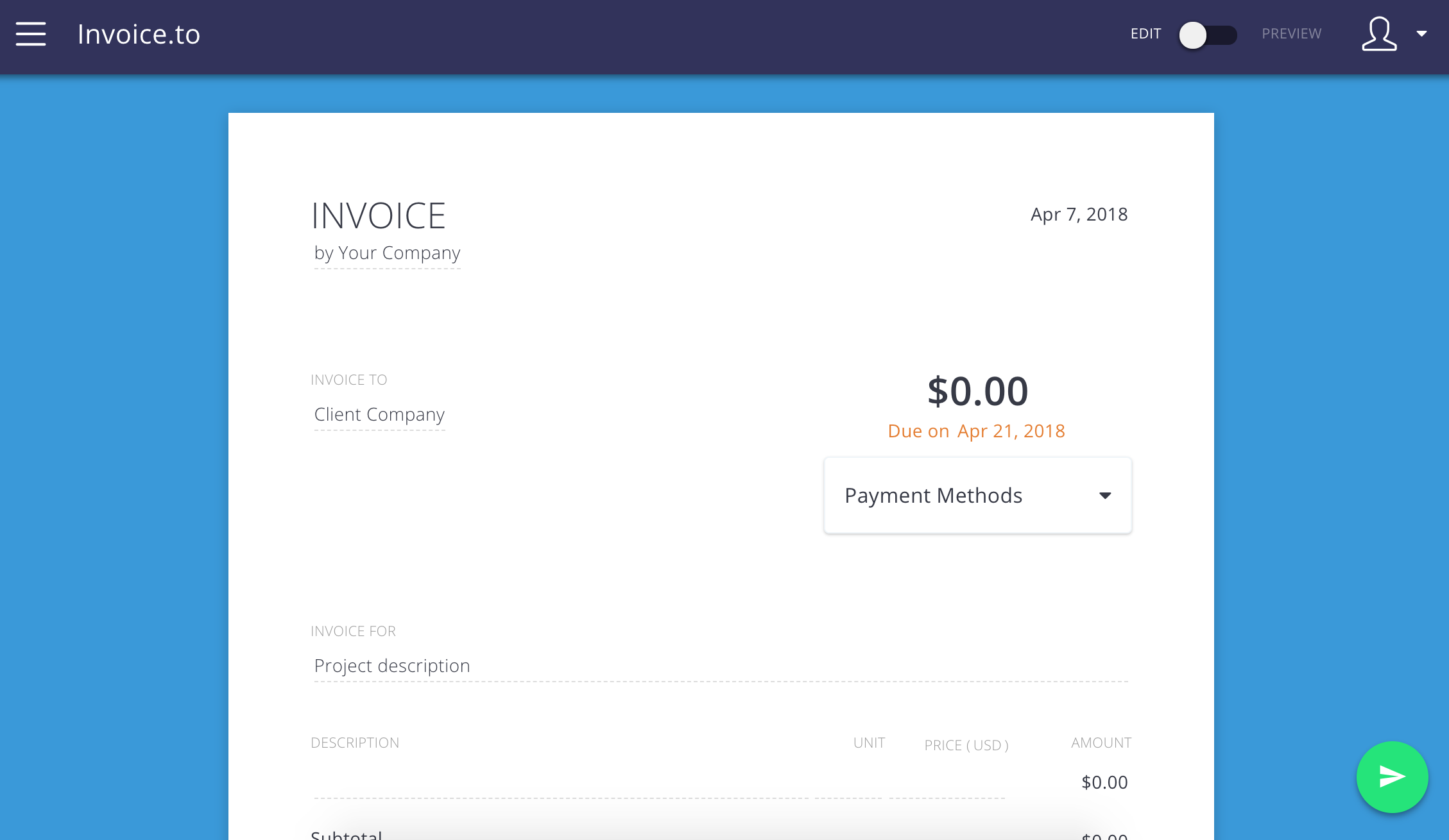 إذا أردت إرسال فاتورة لأحد عبر الإنترنت، فهذا الموقع يعمل لك فواتير مجانية لإرسالها لعملائك، مع امكانية وضع اسم مؤسستك ووضع المبالغ وغيرها بشكل سهل، ثم حفظها PDF وإرسالها للعميل..