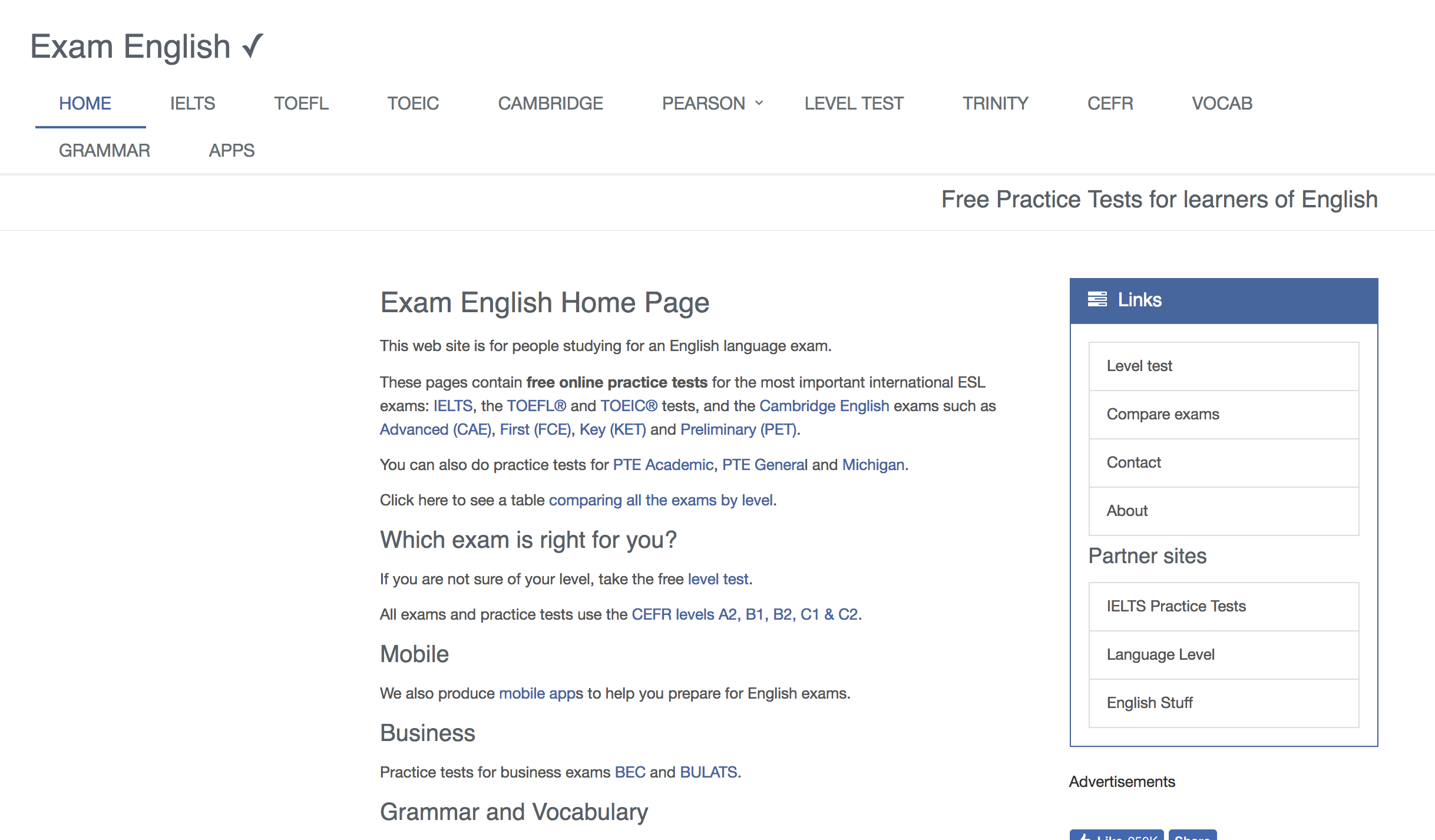 موقع يهيئك لأداء أي اختبار لغة إنجليزية مثل التوفل والايلتس وغيرها، بحيث يعطيك أمثلة لطريقة الاختبار، مع اختبارات لقياس مستواك.