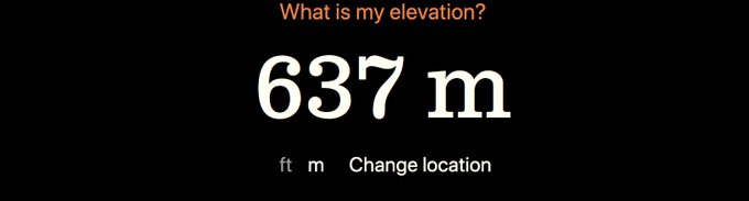 خدمة تعطيك ارتفاعك الحالي عن سطح البحر من مكانك الآن! افتح الصفحة واسمح بتحديد موقعك، بعدها سيظهر لك ارتفاعك، ويمكنك الضغط على حرف m لإظهار ارتفاعك بوحدة المتر بدل القدم..
