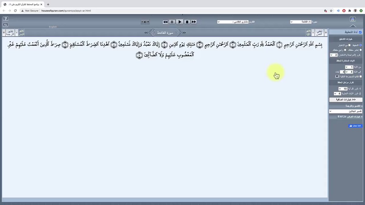 من أفضل خدمات تسهيل حفظ القرآن للصغار والكبار! بحيث توفر لك عدد من المزايا المفيدة، مثل التكرار وتحديد نطاق الحفظ وعدد مرات التكرار وإخفاء الآيات للتأكد من الحفظ والتفاسير وغيرها..