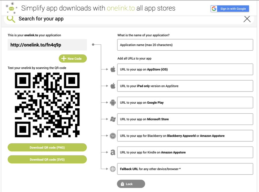 حيث بعد دخولك ضع رابط التطبيق في متجر الآيفون، ورابطه في متجر الاندرويد ثم انشر الرابط الذي يولده لك.
