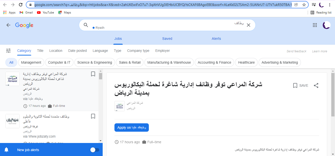 خدمة من Google للبحث عن الوظائف في أي مكان وباللغة العربية! بحيث بإمكانك تحديد نوع الوظيفة ومجالها ثم استعراض ما يناسبك منها والتقديم عليها..