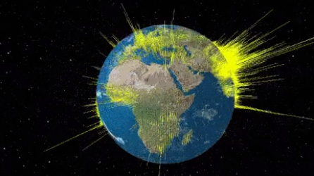 صورة متحركة للكرة الأرضية توضح عدد سكان كل دولة بالرسم البياني، كلما طال اللون الأصفر كان عدد السكان أكثر..