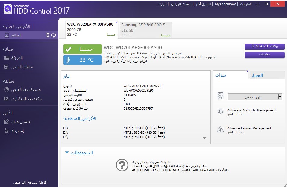 برنامج ASHAMPOO HDD لإدارة الهاردسكات وعمل النسخ الاحتياطي ومراقبتها باللغة العربية.