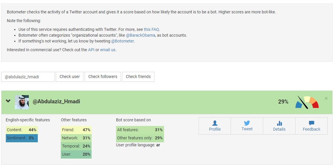 إذا أردت التأكد من حساب تويتر ما؛ يديره شخص حقيقي أو أنه آلي، استخدم خدمة التحليل التالية، إذا أقل من 80% فهو إنسان.