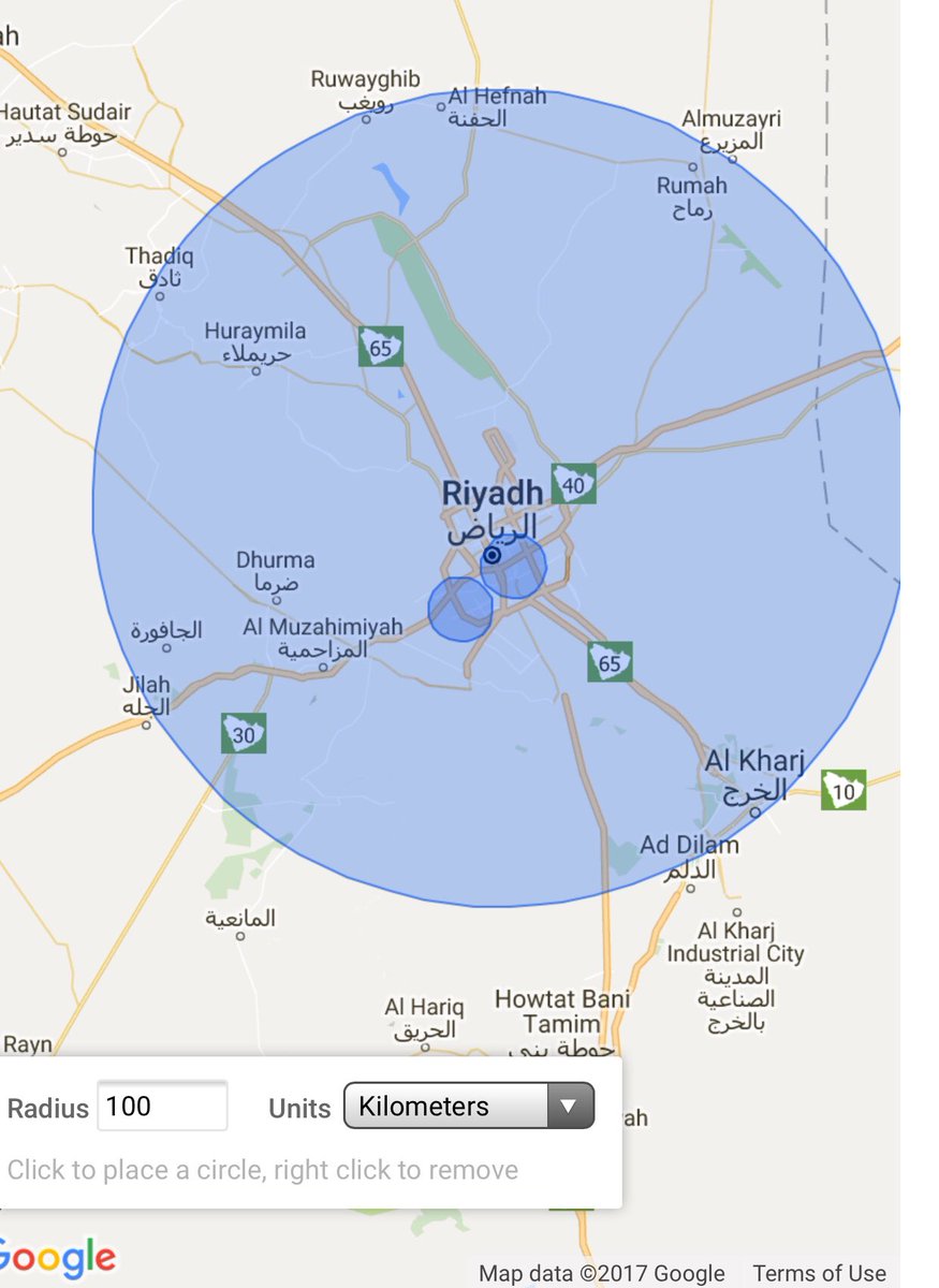 إذا أردت رسم دائرة نطاق بأي حجم تحدده على أي خريطة، استخدم هذه الخدمة، فقط اكتب المساحة ثم اضغط على المكان المراد.