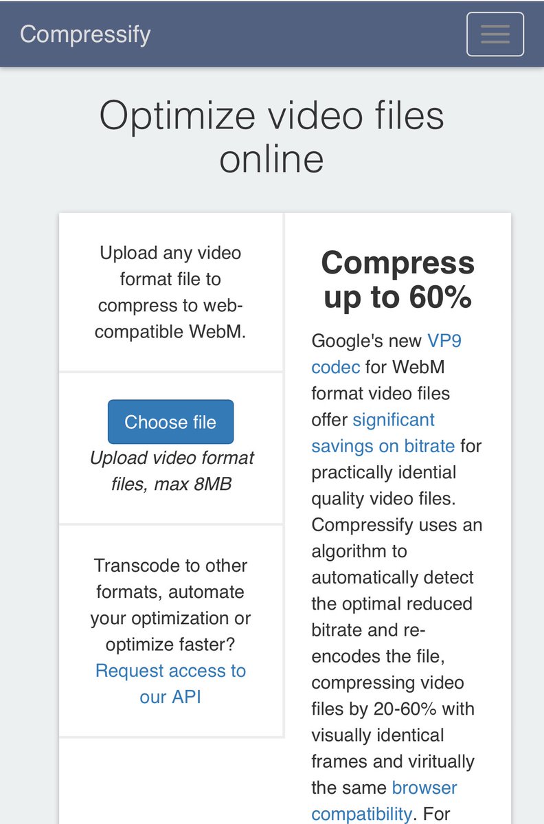 موقع يضغط لك حجم أي ملف فيديو ويصغر حجمه حتى ٦٠٪ من حجمه الطبيعي (بشرط ألا يزيد حجم الفيديو عن ٨ ميغا بايت).