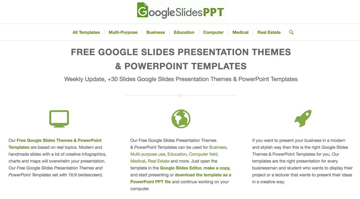 مكتبة ضخمة لقوالب العروض المجانية لشرائح جوجل درايف، وبامكانك تحويلها إلى شرائح بوربوينت، جميلة في تصميمها وعصرية..