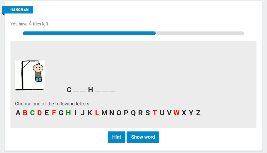 لعبة "الرجل المشنوق" للمساعدة في تعلم الانجليزية اختر من الأحرف حتى تصل للكلمة المرادة، ولك عدد معين من المحاولات.