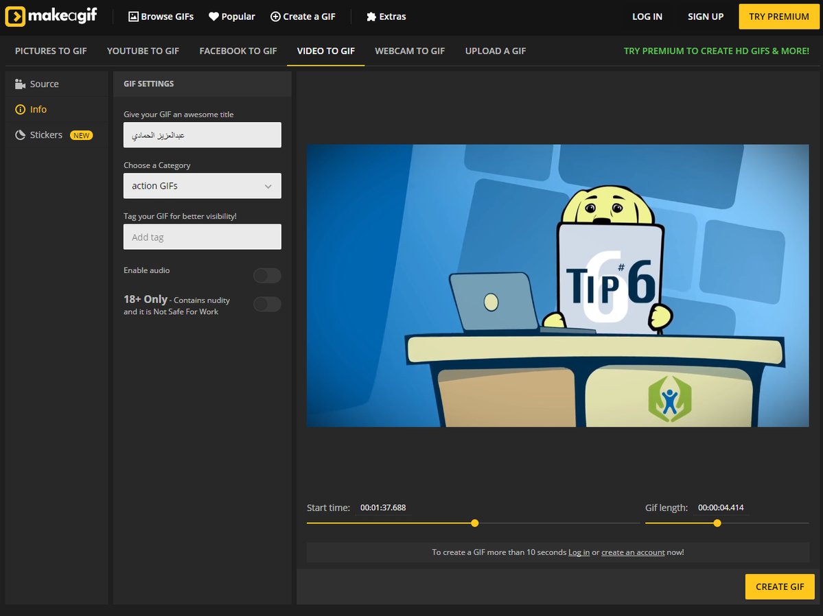موقع جميل يقوم بتحويل أي جزء من مقطع فيديو من جهازك أو من اليوتيوب لصورة متحركة بحجم صغير فقط ارفع المقطع ثم حدد المكان الذي تريد اقتصاصه وفترة الاقتصاص ثم احفظها.