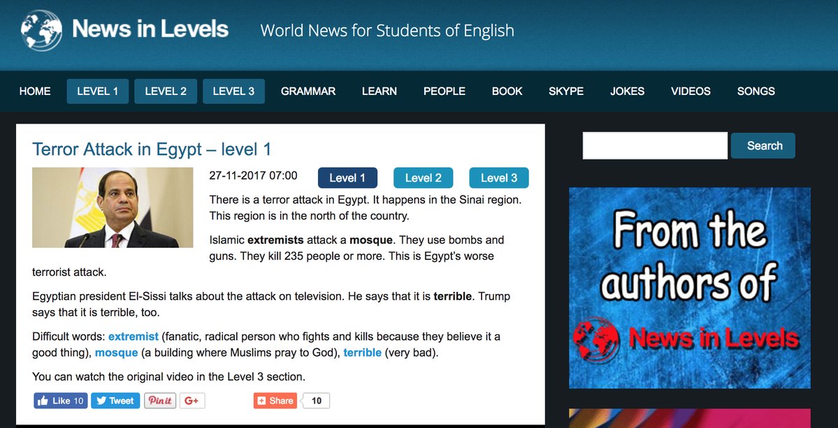 موقع رائع يعرض لك آخر الأخبار العالمية باللغة الإنجليزية عبر ٣ مستويات من الصعوبة، ويُخرج لك كذلك منها أهم الكلمات ويشرحها لك، يعني تقرأ أخبار وتتعلم :).