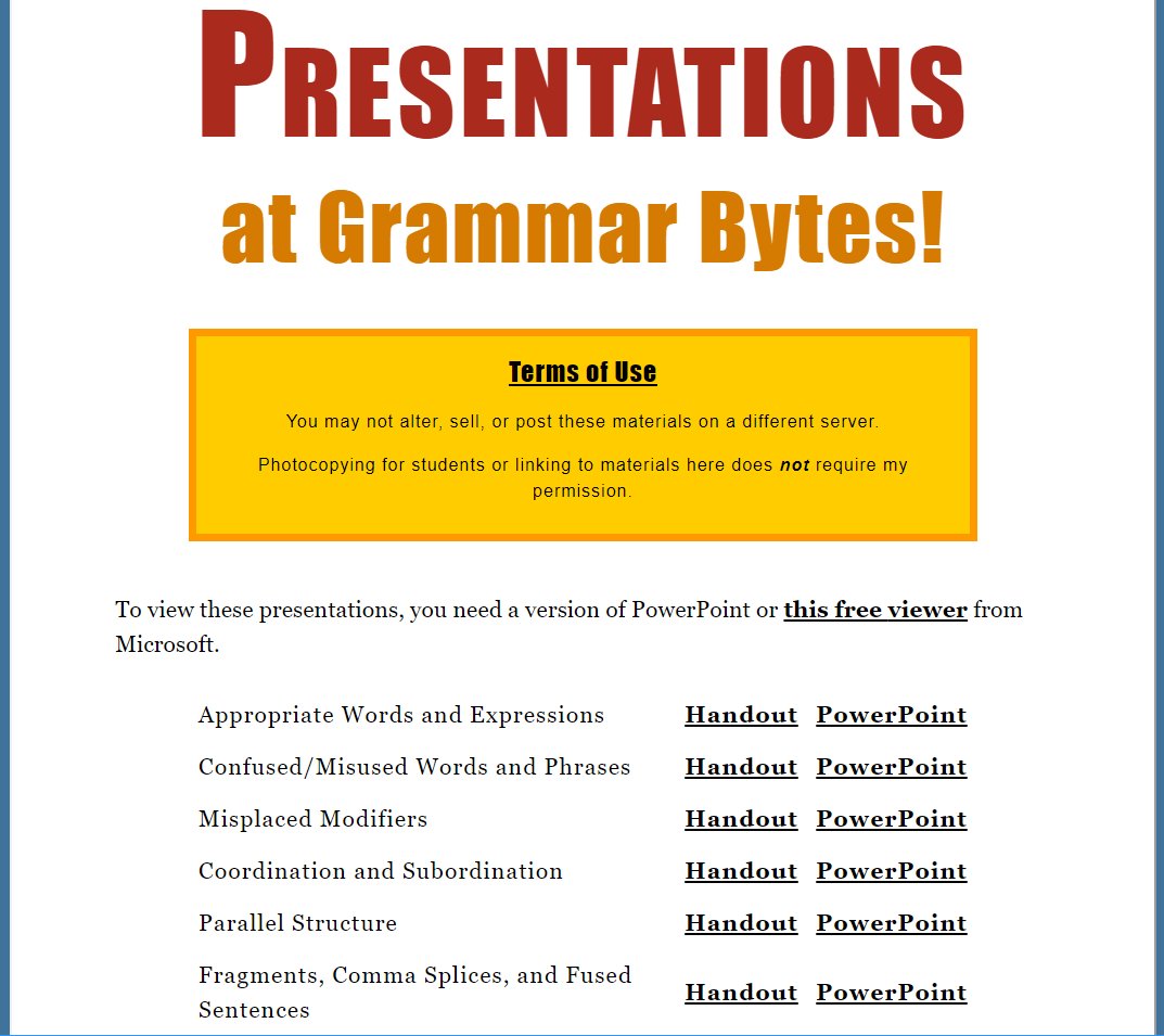 صفحة فيها عدد من عروض البوربوينت تشرح اللغة الانجليزية بطريقة جميلة، مع وجود ملف خاص بالأسئلة التي ستُطرح أثناء أو بعد الدرس.