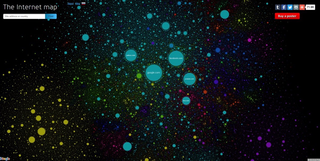 موقع جميل يعرض لك "خريطة الإنترنت"، كلما كانت دائرة الموقع كبيرة كلما كان عدد الزيارات عليه كبير، وعند النقر على أي موقع يعطيك بعض التفاصيل عنه .